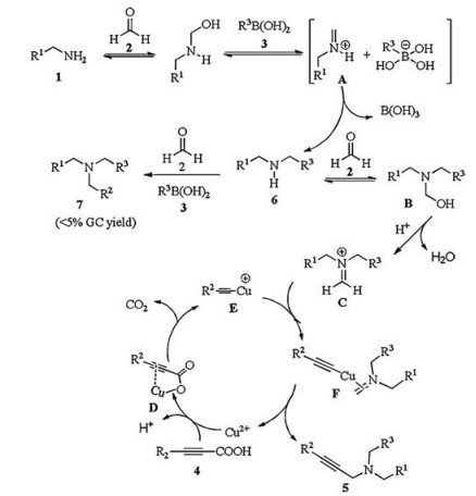 On the basis of previously reports [16], we propose a plausible mechanism as shown in Scheme 2. The reaction of primary amine 1, formaldehyde 2, and organoboronic acid 3 afforded a secondary amine 6 via the PBM reaction [17], the intermediate 6 could undergo a second PBM reaction with formaldehyde 2 and organoboronic acid 3 to produce the byproduct 7 which was detected by GC-MS [18]. The reaction of the secondary amine 6 and formaldehyde 2 generated hemiaminal B. The decarboxylation process is initiated by cation exchange between propiolic acid 4 and the copper salt affording copper species D. Cu(Ⅱ)-catalyzed decarboxylation of D to alkynylcopper E followed by coupling reaction with iminium salt C affording propargylamine copper complex F [13b]. The final desired propargylamine was generated from intermediate F along with the regeneration of the Cu(Ⅱ) catalyst.