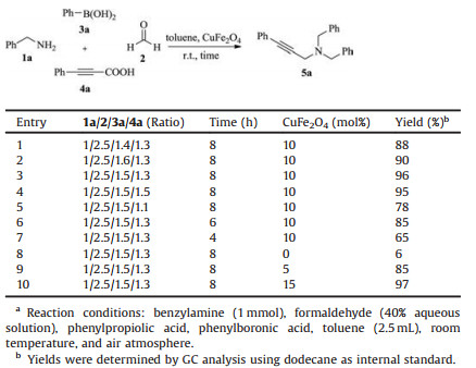 As part of our ongoing interest in the synthesis of propargylamines, we reported our investigation on the application of copper ferrite (CuFe2O4) nanoparticles for the practical and atom-economic synthesis of propargylamines through four-component coupling of amines, formaldehyde, arylboronic acids and alkynyl carboxylic acid (Scheme 1). At the end of reaction, the CuFe2O4 nanoparticles can be easily recycled by an external magnet and reused without obvious loss of catalytic activity (the preparation of nano CuFe2O4 has been provided in the Supporting information).