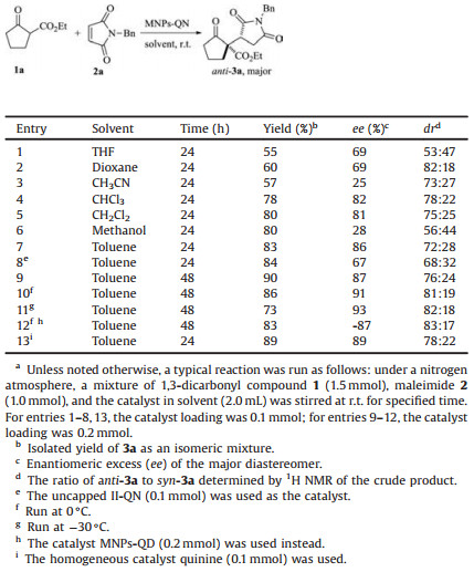 We then evaluated the catalytic efficiency and stereoselectivity of the prepared MNPs-QN and MNPs-QD as chiral organocatalysts. The Michael addition reactions of various carbon nucleophiles provide a powerful toolbox for the carbon-carbon bond formation in organic synthesis [32]. Also, both quinine and quinidine could efficiently catalyze highly enantioselective Michael addition reaction of 1, 3-dicarbonyls and maleimides [33]. Accordingly we chose this reaction to evaluate MNPs-QN and MNPs-QD. The preferable reaction conditions for MNPs-QN-catalyzed asymmetric Michael addition reaction were first surveyed with 1, 3-dicarbonyl compound 1a and maleimide 2a used as the model substrates (Table 1). Under the typical conditions and with the catalyst MNPs-QN (200 mg, 0.1 mmol) employed, the model reaction of cyclic β-ketoester 1a (1.5 mmol) and maleimide 2a (1.0 mmol) was respectively run in a series of common solvents for 24 h (Table 1, entries 1–7). The model reactions afforded the Michael addition product 3a in moderate to good yields with varied stereoselectivities. Polar acetonitrile and protic methanol were not suitable for this reaction with respect to stereoselectivity (entries 3 and 6); toluene was the preferable solvent, affording good yield and enantioselectivity (entry 7). For the purpose of comparison, the uncapped Ⅱ-QN was also tested as catalyst, giving inferior stereoselectivity (entry 8). The increase of the catalyst loading to 0.2 mmol and elongation of the reaction time to 48 h led to an improved yield and slightly better stereoselectivity (entry 9). Run at lower temperatures (0 ℃ and −30 ℃), the model reaction gave better stereoselectivities but slightly lower yields (entries 10 and 11). At 0 ℃, another catalyst MNPs-QD (0.2 mmol) was used instead of MNPs-QN, giving comparable yield and stereoselectivity. As expected, the opposite enantiomer of the major diastereomer 3a was obtained as the major product (Table 1, entry 12). Finally, the homogeneous quinine-catalyzed model reaction was also conducted, giving the same product 3a in comparable yield and enantioselectivity (entry 13). This result implies that the quinine-immobilized catalyst MNPs-QN behaves in the Michael reaction similarly to the homogeneous catalyst quinine. Considering both yield and stereoselectivity, the reaction conditions for entry 10 were chosen as the optimal.