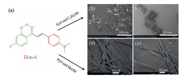| Fig. 1. (a) Self-assembly of DMF-HPPO into 1D microwires and 2D microdisks, (b, c) SEM images of the as-prepared 2D microdisks and (d, e) 1D microwires. | |