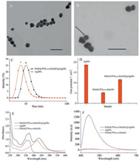 | Fig. 1. The characterization of the P(MACPTS-co-MAGP)@AgNPs nanoparticles. TEM images of AgNPs (A) and P(MACPTS-co-MAGP)@AgNPs (B). Scale bar is 100 nm. (C) DLS data of AgNPs before and after covering with P(MACPTS-co-MAGP). (D) Zeta potentials of AgNPs, P(MACPTS-co-MAGP) and P(MACPTS-co-MAGP)@AgNPs. (E) UV-vis spectra of AgNPs, P(MACPTS-co-MAGP) and P(MACPTS-co-MAGP)@AgNPs. (F) Fluorescence emission spectra of the AgNPs, P(MACPTS-co-MAGP) and P (MACPTS-co-MAGP)@AgNPs. | |