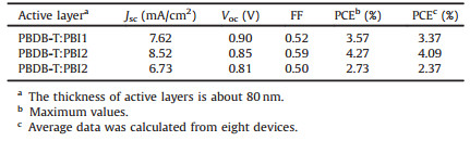 Table 3 Solar cell parameters of optimized solar cells of PBDB-T:PBI-based acceptors (1:1). |