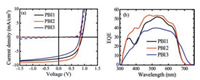 | Fig. 3. (a) J-V characteristics in the dark (dashed lines) and under white light illumination (solid lines). (b) EQE of the optimized solar cells of PBDB-T:PBI-based acceptors. Thin films were fabricated from CB/DIO (0.5%) with the thickness around 80 nm. | |