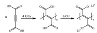 Comparing with the PIP of the acid at 5 GPa, the PIP of the Li+ salt happens at a much higher pressure. This should be attributed to the electrostatic repulsion between the carboxylate anions. In previous PIP reports, the PIP of the anions usually happens at much higher pressures. For example, the pressure for PIP of C2H2 is ~4 GPa at room temperature [5], while that for CaC2 is above 20 GPa [8]. The pressure for PIP of HCN is ~1 GPa [6], while that for NaCN and KCN are ~30 GPa [7]. Such a huge difference suggests that we need to go through the following route (Scheme 2) to synthesize large amount of the proposed electrode material. This result also implies that we can search precursors with a lower pressure for polymerization and obtain the target material by postprocessing, which broadens the application of PIP for synthesizing new materials.
