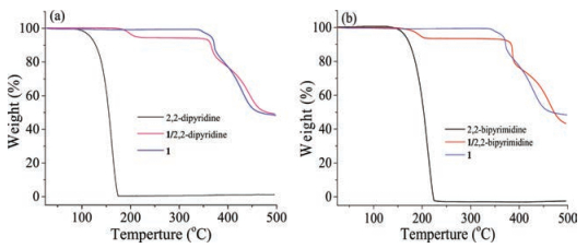 | Fig. 1. TGA plots of compounds 1, 2, 2-dipyridine and complex 1/2, 2-dipyridine (a), and the ones of compounds 1, 2, 2-bipyrimidine and complex 1/2, 2-bipyrimidine (b). | |