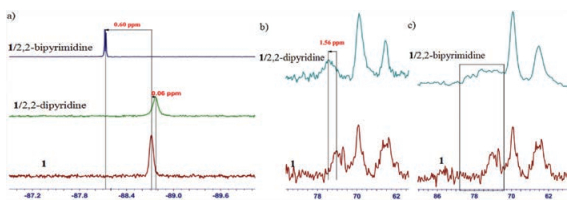 | Fig. 2. a) 19FNMR spectra of 1, 1/2, 2-dipyridine and 1/2, 2-bipyrimidine in the CDCI3; b) Solid-state 13C NMR spectra of 1 and 1/2, 2-dipyridine; c) Solid-state 13C NMR spectra of 1 and 1/2, 2-bipyrimidine. | |