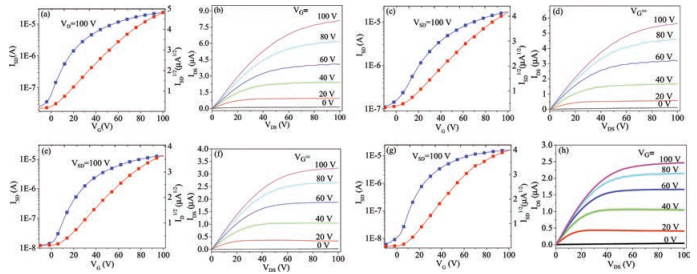 | Fig. 3. Transfer and output characteristics of as-spun OFETs based on active layers of 1/2, 2-dipyridine (a, b), 1/2, 2-bipyrimidine (c, d), 2/2, 2-dipyridine (e, f) and 2/2, 2-bipyrimidine (g, h), respectively. | |