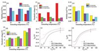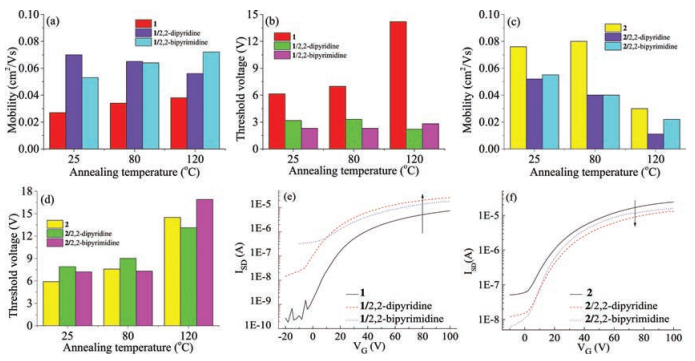 | Fig. 4. The column images for electron mobility of OFETs based on active layers of compound 1 (red), 1/2, 2-dipyridine (purple) and 1/2, 2-bipyrimidine (blue) (a), and of compound 2 (yellow), 2/2, 2-dipyridine (purple) and 2/2, 2-bipyrimidine (blue) (c) as a function of annealing temperature; The column images for the threshold voltage (absolute value) of OFETs based on active layers of compound 1 (red), 1/2, 2-dipyridine (green) and 1/2, 2-bipyrimidine (prunosus) (b), and of compound 2 (yellow), 2/2, 2-dipyridine (green) and 2/2, 2-bipyrimidine (prunosus) (d) as a function of annealing temperature; transfer characteristics of OFETs based on active layers of: compound 1, 1/ 2, 2-dipyridine and 1/2, 2-bipyrimidine (e), and of compound 2, 2/2, 2-dipyridine and 2/2, 2-bipyrimidine (f), respectively. | |
