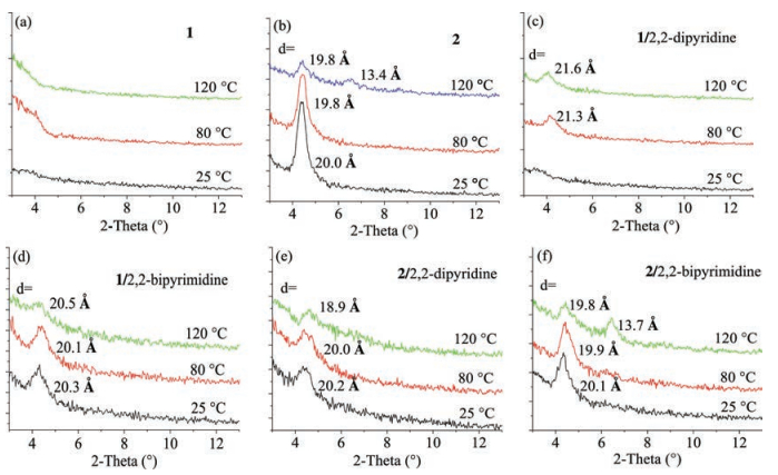 | Fig. 5. XRD patterns of spin-coated thin films of compound 1 (a); compound 2 (b); 1/2, 2-dipyridine (c); 1/2, 2-bipyrimidine (d); 2/2, 2-dipyridine (e); and 2/2, 2-bipyrimidine (f) after thermal annealing at different temperatures. | |