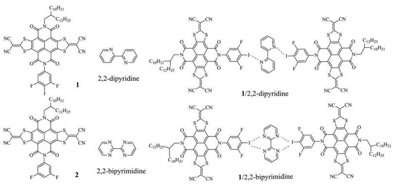 Organic π-functional materials with tunable electrical and optical properties have attracted tremendous attention in recent decades due to their potential applications in organic field-effect transistors (OFETs) [1], organic light-emitting diodes (OLEDs) and organic photovoltaics (OPVs) [2]. Besides the molecular structure itself, the appropriate arrangement of molecules of organic semiconductors (OSCs) in the solid state is crucial for improving their device performance, but rational molecular design and synthetic concepts are difficult to control molecular solid-state assembly by weak intermolecular interactions [3]. To improve device performance, a variety of non-covalent interactions have been employed for self-assembly of π-conjugated molecules, including Coulombic interactions, van der Waals forces, hydrophobic interactions, ionic interactions, π-π stacking, H bonding and halogen bonding (XB) [4]. Among them, H bonding has been successfully used to construct supramolecular architectures due to its high directionality that provides high selectivity [5]. XB exhibits similarity in directionality and strength with H bonding and would be a new approach to control supramolecular assembly.