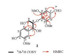 Compound 2 was obtained as light yellow solid with [α]D20 +0.04 (c 0.08, MeOH). Its IR spectrum showed the presence of hydroxy (3387 cm-1) and aromatic (1688 cm-1, 1589 cm-1) functionalities. The molecular formula (C19H22O8) with 9 degrees of unsaturation was determined by HR-ESIMS at m/z 401.1218 [M + Na]+. The NMR data (Table 2) indicated that there are both guaiacylglycerol-8-yl and 3'5'-dimethoxy-4'-oxyphenyl groups in 2. The 1H NMR data of 2 showed signals attributed to one oxymethylene at δH 3.72 and δH 3.36, together with two signals attributed to two oxymethines at δH 4.92 and δH 4.29. The 1H NMR data of 1 also showed one group of 1, 3, 4-tri-substituted benzene ring signal at δH 6.91, δH 6.64, and δH 6.76, together with one group of 1, 3, 4, 5-tetra-substituted benzene ring signal at δH 7.15. The 13C NMR and DEPT spectra (Figs. S13-14 in Supporting information) of 2 showed 19 carbon resonances including twelve aromatic carbons. The 1H-1H COSY correlations (Figs. S15-16 in Supporting information) indicated the presence of CH(7)-CH(8)-CH2(9) units. The 1H NMR and 13C NMR data of 2 resembled those of the known compound, (+)-(7S, 8S)-4-hydroxy-3, 3', 5'-trimethoxy-8', 9'-dinor-8, 4'-oxyneolignan-7, 9-diol-7'-oic acid [14], except for substitution of CHO-1' in 2 by COOH-1' in (+)(7S, 8S)-4-hydroxy-3, 3', 5'-trimethoxy-8', 9'-dinor-8, 4'-oxyneolignan-7, 9-diol-7'-oic acid, which was indicated by the chemical shifts for C-1' and C-4' significantly shifted by ΔδC 9.7 and 3.6, respectively. In the HMBC spectrum (Fig. S17 in Supporting information), the correlations of H-7 with C-2, C-6, C-8, and C-9, of H-2'/6' with C-3'/5', C-4' and CHO, and of OMe-3'/5' with C-3'/5' verified the location of the substitution groups and the 8, 4'-oxy linkage in 2. The HMBC spectrum also showed correlations of aldehyde hydrogen between C-10 and C-2'/6', which indicated the presence of one aldehyde group (Fig. 4).