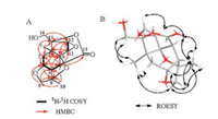 | Fig. 2. Selected 1H-1H COSY (▂) and HMBC correlations (H → C) (A), and key ROESY correlations (H↔H) (B) of compound 1. | |