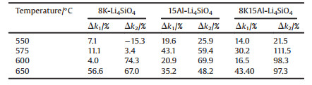 To further investigate the kinetic results, the incremental quantities of k1 and k2 values were calculated at corresponding temperatures. The data are listed in Table 2. After doping K and Al, the k1 and k2 values were increased, and the range of k2 values increased more. It indicates that lithium migration process have been much more affected by doping method. The addition of K mainly reflected lithium migration at above 600 ℃, and k2 values increased by more than 65%. However, when doping with Al, the lithium migration rate has been greatly improved at below 600 ℃, and k2 values increased by almost 60%. The lithium migration rate of 8K15Al-Li4SiO4 is ~2 times higher than that of the pristine Li4SiO4 at 575–650 ℃ compared with the pristine Li4SiO4.