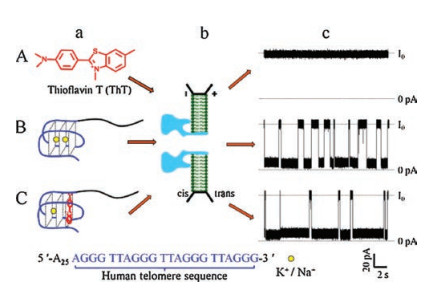 Nanopore technology utilizing a molecular-scale pore structure for single-molecule study is very sensitive for detecting nucleic acid sequence and its interactions with binding ligands [10-14]. Compared with other single-molecule technologies such as singlemolecule fluorescence resonance energy transfer (FRET) spectroscopy [15] and optical tweezers [16], the nanopore technology overcomes the limitations of time-consuming, costly fluorescent labeling and costly chemical modification. α-Hemolysin (α-HL) nanopore can be used to directly investigate the folding and unfolding of a G-quadruplex [17, 18]. The bacterial protein α-HL can self-assemble across a lipid bilayer membrane and form a mushroom-shaped nanopore with the smallest diameter of ~1.4 nm [19]. When nucleic acid molecule is electrophoretically driven through the pore, ionic current will be interrupted and this perturbation can be recorded as characteristic electric signals, which can reveal structural information of the individual nucleic acid molecule. The α-HL nanopore has exhibited many advantages in single-molecule characterization of various G-quadruplex structures induced by small molecules such as PDS [20], ATP [21], Pb2+ and Ba2+ [22] based on the pore blockage properties. For example, a previous research successfully utilizes the electrochemical confined space of nanopore, which could efficiently convert single molecule characteristics into measurable electrochemical signals with high signal-to-noise ratio [23, 24], to achieve the discrimination of the conformational changes of the Gquadruplex structure [21]. Therefore, extending this strategy for further studying the interactions of G-quadruplex with ThT, a highly selective G-quadruplex ligand, as well as the structural change of G-quadruplex induced by ThT is of great importance.