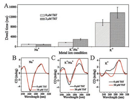 | Fig. 3. (A) Histogram of dwell time under various metal ion concentrations for the Tel DNA and Tel DNA/ThT complex at 160 mV. The concentrations of Tel DNA and ThT were 0.25 mmol/L and 2.0 mmol/L, respectively. (B-D) CD spectra recorded for the Tel DNA and Tel DNA/ThT complex at different metal ion concentrations. The concentrations of Tel DNA and ThT were 6.25 mmol/L and 50 mmol/L, respectively. All experiments were conducted in 50 mmol/L Tris-HCl buffer (pH 7.2) containing (B) 500 mmol/L NaCl, (C) 50 mmol/L KCl and 450 mmol/L NaCl, (D) 500 mmol/L KCl, respectively. Each experiment was performed three times independently | |