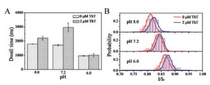| Fig. 4. The effect of pH on the dwell time (A) and current blockade (B) of the Tel DNA and Tel DNA/ThT complex at 160 mV. All experiments were conducted in 50 mmol/L Tris-HCl buffer containing 50 mmol/L KCl and 450 mmol/L NaCl, with different pH values of 8.0, 7.2 or 6.0. The concentrations of Tel DNA and ThT were 0.25 mmol/L and 2.0 mmol/L, respectively. Each experiment was performed three times independently | |