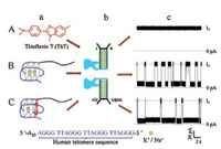 | Fig. 1. The characterization of G-quadruplex binding with ThT through α-HL nanopore in the electrolyte solution containing 50 mmol/L KCl and 450 mmol/L NaCl. [A–C] (a) Schematic illustration of ThT, Tel DNA and Tel DNA/ThT complex. (b) Illustration of α-HL nanopore inserted in a lipid bilayer. [A–C] (c) Representative single-channel current traces of the translocation of ThT, Tel DNA and Tel DNA/ThT complex. All experiments were conducted at the transmembrane potential of +160 mV. The concentrations of Tel DNA and ThT were 0.25mmol/L and 2.0 mmol/L, respectively. Each experiment was performed three times independently | |