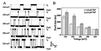| Fig. 2. The effect of transmembrane potential on the dwell time of the G-quadruplex in the electrolyte solution containing 50 mmol/L KCl and 450 mmol/L NaCl. (A) Representative single-channel current traces for Tel DNA/ThT complex translocating through α-HL nanopore with the transmembrane potential of 140, 160, 180, 200 and 220 mV. (B) Histogram of dwell time under various applied potentials (trans vs. cis) for the Tel DNA and Tel DNA/ThT complex. The concentrations of Tel DNA and ThT were 0.25 mmol/L and 2.0 mmol/L, respectively. Each experiment was performed three times independently | |