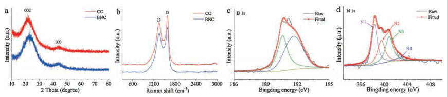 | Fig. 2. (a) XRD patterns and (b) Raman spectra of the CC and BNC. High-resolution B 1s (c) and N 1s (d) XPS spectra of the BNC. | |