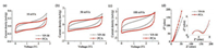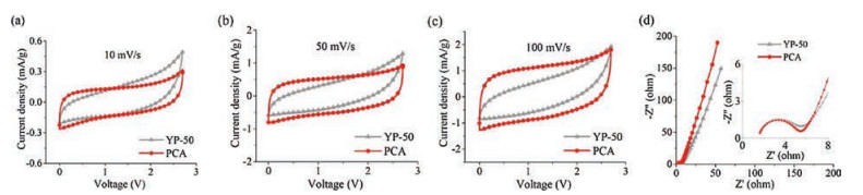 | Fig. 4. CV curves of PCA and YP-50 in the voltage range of 0-2.7 V at different sweep rates: (a) 10 mV/s, (b) 50 mV/s and (c) 100 mV/s. (d) Electrochemical impedance spectra of PCA and YP-50. | |
