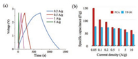 | Fig. 5. (a) Galvanostatic charge-discharge curves of PCA and (b) the specific capacitances of PCA and YP-50 at various current densities. | |