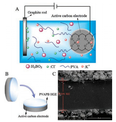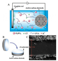 | Fig. 1. (A) Schematic of in situ electrodeposition of PVAPB HGE on AC electrode. (B) Schematic of fabrication of symmetric SCs. (C) SEM image of the cross-section of PVAPB HGE layer. | |