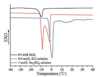 The stability of aqueous SCs at low temperature mainly depends on the freezing point of the electrolyte. Therefore, The PVAPB HGE and the liquid electrolytes (0.9 mol/L KCl and 1 mol/L Na2SO4) were analyzed with differential scanning calorimetry (DSC) (NETZSCH DSC 204 F1, Germany) to observe their temperature stability. DSC samples (5–8 mg) were sealed in aluminum pans and then cooled to -40 ℃ at a rate of 10 ℃/min in a nitrogen atmosphere. After the freezing process, the samples were heated to 40 ℃ at a speed of 2 ℃/min. DSC diagrams of PVAPB HGE, 0.9 mol/L KCl, and 1 mol/L Na2SO4 electrolytes were shown in Fig. 2 to compare their thermal properties at low temperature. There was one endothermic peak at about 0.57 ℃ in DSC diagram of 1 mol/L Na2SO4 solution, which was attributed to the fact that saturated Na2SO4 solution would hardly change the freezing point of water [20]. By contrast, KCl salt had a higher solubility than Na2SO4 salt in water at low temperature, resulting in the phenomenon that the addition of KCl salt would obviously impact on the freezing point of water. There were two endothermic peaks at about -8.7 ℃ and -1.9 ℃ in the DSC diagram of 0.9 mol/L KCl solution. The peak at -8.7 ℃ was attributed to the freezing of water molecules that interacted with K+ and Cl- ions, and that at -1.9 ℃ indicated the free water molecules in 0.9 mol/L KCl solution. As for PVAPB HGE, There was only one endothermic peak at about -9.4 ℃ in its DSC diagram, which was different from that of 0.9 mol/L KCl solution. It indicates that the water molecules in PVAPB HGEs are mainly in bonding state. These bonding water molecules produced by the strong hydrogen bond interaction between water molecules and PVA in PVAPB HGEs may not even be frozen, which can reduce the freezing point of PVAPB HGE. The lowest freezing point of PVAPB HGE suggested that it should be more stable than other liquid aqueous electrolytes at low temperature.