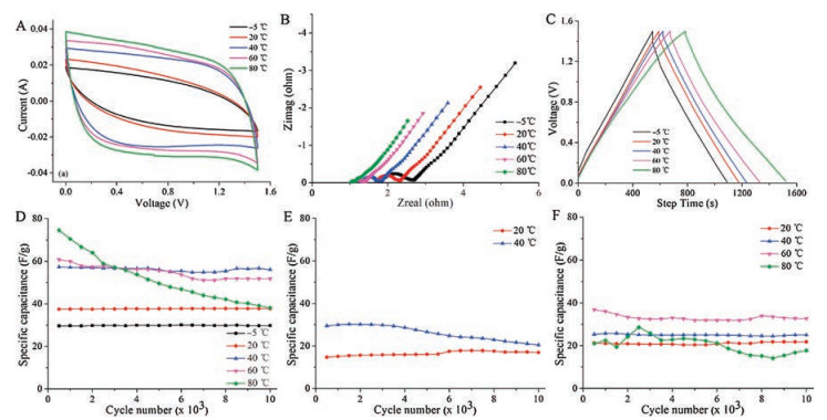| Fig. 3. (A) CV curves o the PVAPB HGE SCs with a scan rate of 10 mV/s at different temperatures. (B) The Nyquist plots of the PVAPB HGE SCs at different temperatures. (C) The galvanostatic charge-discharge curves of the PVAPB HGE SCs with the current density of 0.1 A/g at different temperatures. The cycle life of the PVAPB HGE SCs (D), KCl SCs (E), Na2SO4 SCs (F) at the different operating temperature. | |