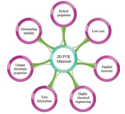2. Two-dimensional perovskite materials2D PVK materials have attracted the interest of researchers in the fields of optoelectronics, microelectronics, and particularly in photovoltaic devices [18, 27]. In fact, 2D PVK materials have extensive possibilities of chemical engineering with significant electronic and light absorption/emission properties at normal temperature [27, 28]. A 2D organic-inorganic PVK material offers hybrids properties of both organic and inorganic parts. The inorganic part shows a wide range of electronic properties, dielectric and magnetic transition, thermal stability, and mechanical hardness, while the organic part offers high polarizability, large fluorescence efficiency, structural diversity, and ease of processing [22]. Various properties of 2D PVK materials are illustrated in Fig. 2.