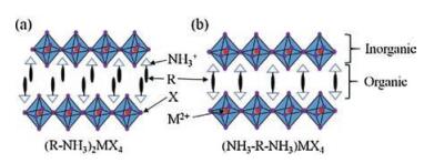 | Fig. 3. Typical structures of the 2D layered hybrid organic–inorganic perovskite for n = 1 with double (a) and single (b) intercalated organic molecule layer. | |