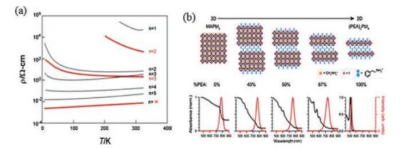 The 2D PVK shows semiconductor-metal transition with increasing perovskite sheets (Fig. 7a) [34]. Recently the charge transport properties in 2D PVK materials were investigated by exploring the effect of MA to PEA ratio in ((PEA)2(MA)n-1PbnI3n+1) on charge carrier mobility, diffusion length, recombination dynamics, and orientation of the 2D PVKs (Fig. 7b) [35]. It was found that the charge carrier recombination rate first decreases with the increase of PEA concentration, which may be due to trap passivation, and then significantly increases owing to the domination of excitonic effect in perovskite thin layers [36].