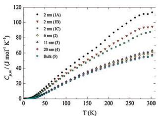 Tan and Wang studied the heat capacities of a series of nano metal oxides, metal and molecular sieve catalyst materials by means of adiabatic calorimetry. It was found that the heat capacity of these nanomaterials were larger than those of their bulk phases. For example, the differences of the heat capacity between the nano and bulk copper and molecular sieve ZSM-5 increase with the temperature increasing. This enhanced heat capacity behavior of nanomaterials was attributed to the factors of density, thermal expansion, impurities, surface adsorption and size effects, etc., and these impact factors may be different for different type of naomaterials [52].