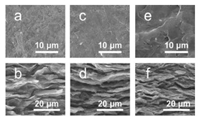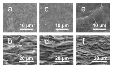 | Fig. 1. (a) Top-view image of graphite. (b) Cross-section image of graphite. (c) Topview image of GOL. (d) Cross-section image of GOL. (e) Top-view image of GOH. (f) Cross-section image of OH. | |