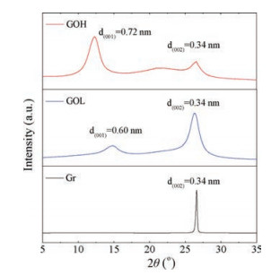 | Fig. 2. XRD patterns of graphite, GOL and GOH. | |