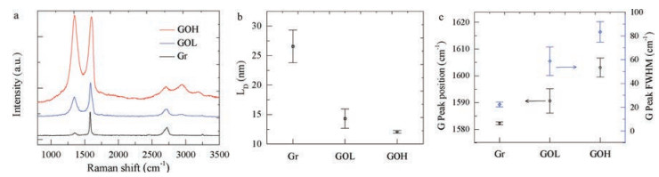 Raman spectroscopy was performed on a LABRAM HR 800 apparatus using 532.08 nm laser as the exciting source. For each sample, five different spots were selected to obtain Raman spectra. Fig. 3a presents the Raman spectra for graphite, GOL and GOH. The characteristic peaks near 1350 cm-1, 1580 cm-1, 2700 cm-1 and 2900 cm-1 correspond to D, G, 2D and D + D' bands, respectively [40]. The prominent features of Raman spectra of graphite and GOs are the difference in the intensity of D band and G band. The G band indicates the existence of sp2 carbon networks, while the D band is due to the structural defects like grain boundaries or the attachment of hetero-atoms [33, 41]. Our XPS results have confirmed the formation of large amount of oxygen-containing functional groups for as-prepared GOs, which is also consistent with the observation by scanning tunnelling microscopy and highresolution transmission electron microscopy [42-44]. The amount of domain boundaries is related to the average sp2 cluster size, which can be obtained byestimating the distance between defects, LD (nm) [40, 45], using the following equation [46],