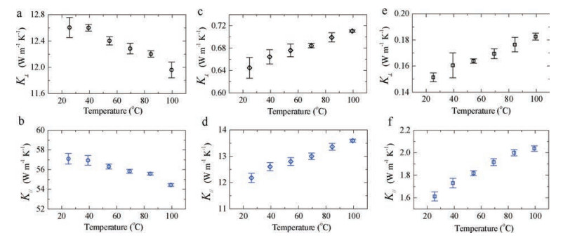 | Fig. 4. Cross-planethermal conductivity(K⊥) of graphite (a), GOL (c) and GOH (e) as a function of temperature. In-plane thermal conductivityof graphite (b), GOL (d) and GOH (f) as a function of temperature. | |