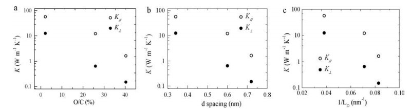 | Fig. 5. Cross-plane (K⊥) and in-plane (K//) thermal conductivities of graphite and GOs at room temperature versus O/C ratio (a), versus d spacing (b) and versus 1/LD (c). Here, solid circles and open circles denote the cross-plane and in-plane thermal conductivities, respectively | |