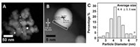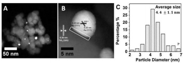 | Fig. 1. (A) HAADF-STEM images of Au/TiO2, (B) high-resolution image that shows the interface of Au-TiO2, (C) size distribution of Au nanoparticles in Au/TiO2. | |