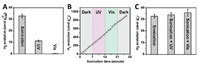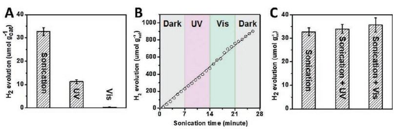 | Fig. 3. Amount of evolved H2 over Au/TiO2 photocatalyst under different experimental conditions. (A) Sonication only or optical excitation only. (B) The accumulated amount of H2 as a function of the sonication time under different conditions. (C) Sonication combined with optical excitation. | |