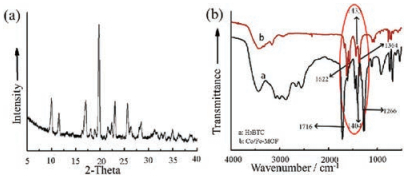 | Fig. 2. (a) XRD pattern of Co/Fe-MOF. (b) Fourier transform infrared spectra of the ligand H3BTC and Co/Fe-MOF. All samples were synthesized at 16.5 MPa and 80 ℃ for 48 h. | |