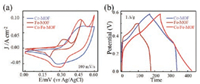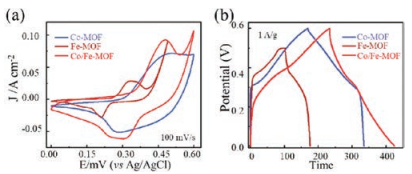 | Fig. 3. (a) CV curves of the Co-MOF, Fe-MOF and Co/Fe-MOF electrodes at the scan rate of 100 mV/s. (b) Galvanostatic charge-discharge profiles of the three MOFs at current densities of 1 A/g. | |