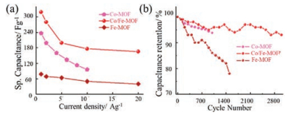 | Fig. 4. (a) Specific capacitances of the Co-MOF, Fe-MOF and Co/Fe-MOF elecrodes at different current densities. (b) Cycling stability of the three MOFs. | |