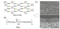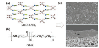 | Fig. 1. (a) View of 1D channel with rich amide groups (blue ball) in MIL-53-NH2; (b) Structure of Pebax; (c) Top and cross-sectional view of MIL-53-NH2@Pebax membrane (15 wt%). | |