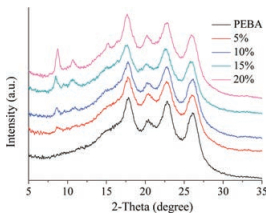 | Fig. 2. PXRD of series MMMs with varied MIL-53-NH2 loading. | |
