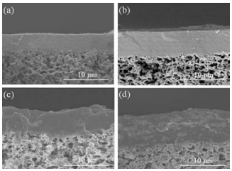 | Fig. 3. Cross-sectional view of series MMMs with varied MIL-53-NH2 loading: (a) 5%, (b) 10%, (c) 15%, (d) 20%. | |