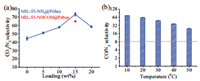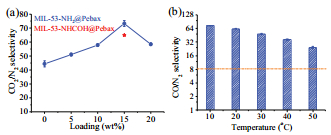 | Fig. 4. (a) CO2/N2 selectivity of neat Pebax membrane and series of MIL-53-NH2 based MMMs with varied filler loading; CO2/N2 selectivity of MIL-53-NHCOH@Pebax membrane (15 wt%) was highlighted by a red star; (b) Effect of operation temperature on CO2/N2 selectivity of MMM-15-NH2. | |