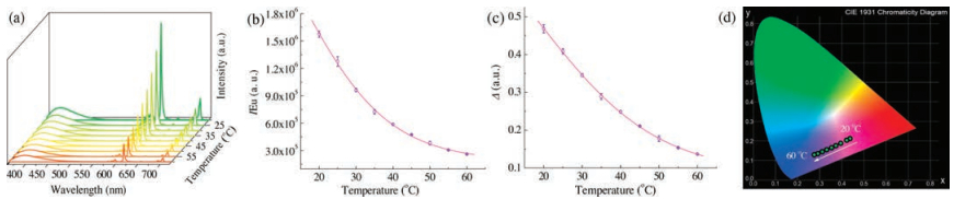 Accurate measurements of temperature within the physiological range are of great importance for understanding physiological/pathological processes, preventing and treating cancers, and controlling drug release systems [1]. On the one hand, temperature affects many physiological processes ranging from gene expression to energy metabolism and it varies from cells to cells depending on their different functionalized biochemical reactions. As such, data on cellular temperatures can provide important insights into physiological processes [2]. On the other hand, the appearance of thermal singularities is one of the first signatures of many diseases such as inflammation, cancer, and cardiac problems. In disease states such as cancer, malignant cells commonly are at elevated temperature than healthy cells [3]. Consequently, it is important to develop techniques that enable reliable and accurate detecting of temperature within the physiological range [4]. To this end, luminescence-based temperature sensors have shown great potential since their non-invasiveness, accuracy, fast response, inertness to strong electromagnetic fields, and low-damage to tissues [5].