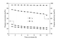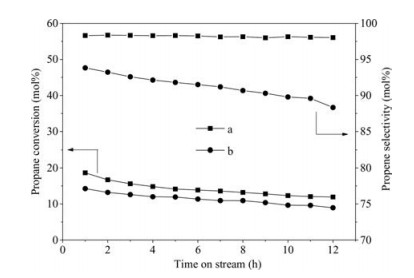 | Fig. 2. The catalytic performances for propane dehydrogenation over the PtSnNa/Al2O3/cordierite monolithic catalyst (curvea)and the granule PtSnNa/Al2O3 catalyst (curve b). | |