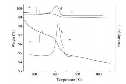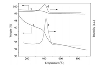 | Fig. 3. Thermogravimetry (TG) and mass spectrometry (MS) curvesof the catalysts: curve a, TG curve of the granule catalyst; curve b, MS curve of the granule catalyst; curve c, TG curve of the monolithic catalyst; curve d, MS curve of the monolithic catalyst. | |