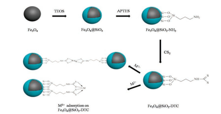 | Fig. 1. Scheme for the synthesis of Fe3O4@SiO2-DTC magnetic particles. | |